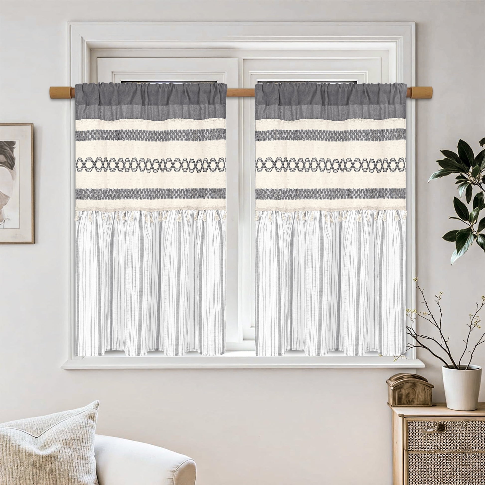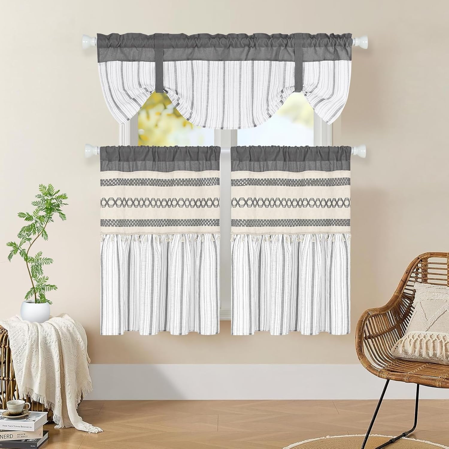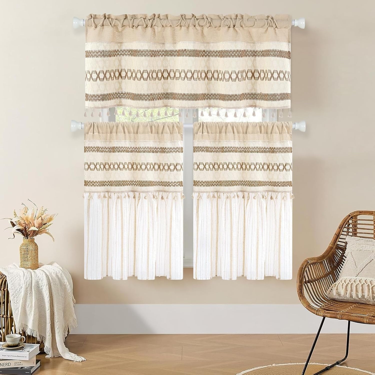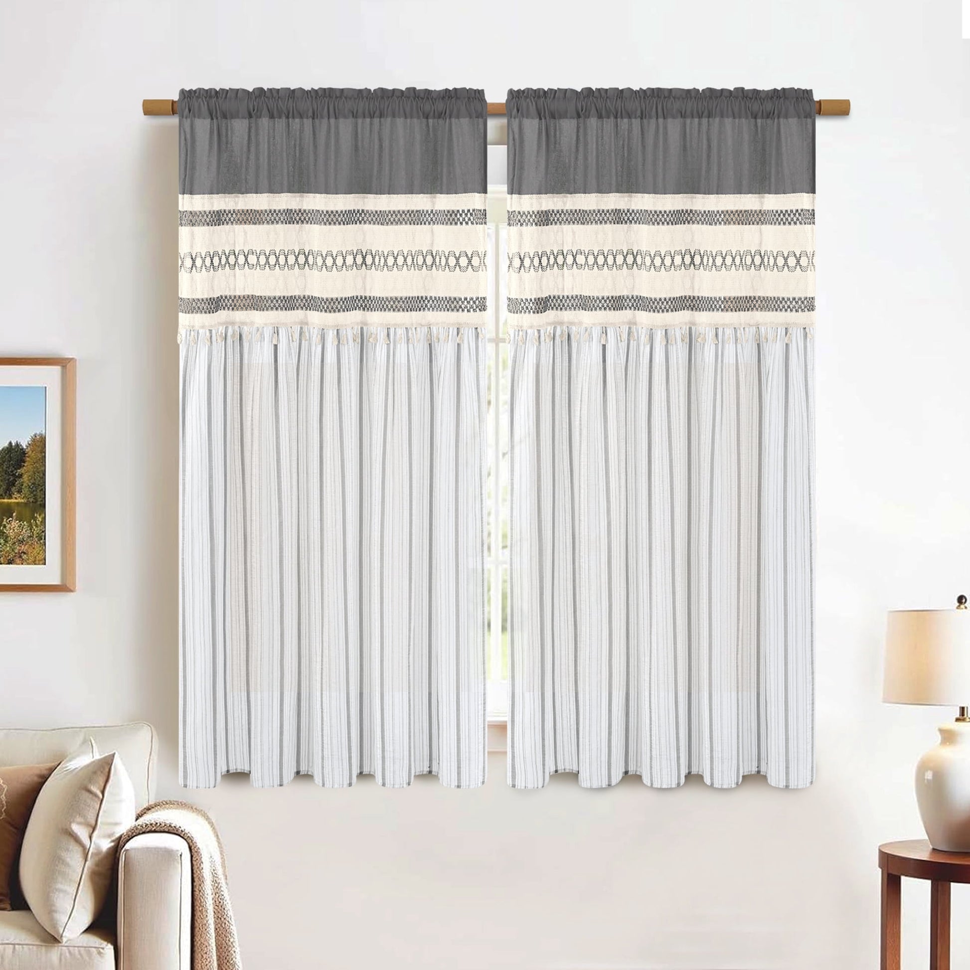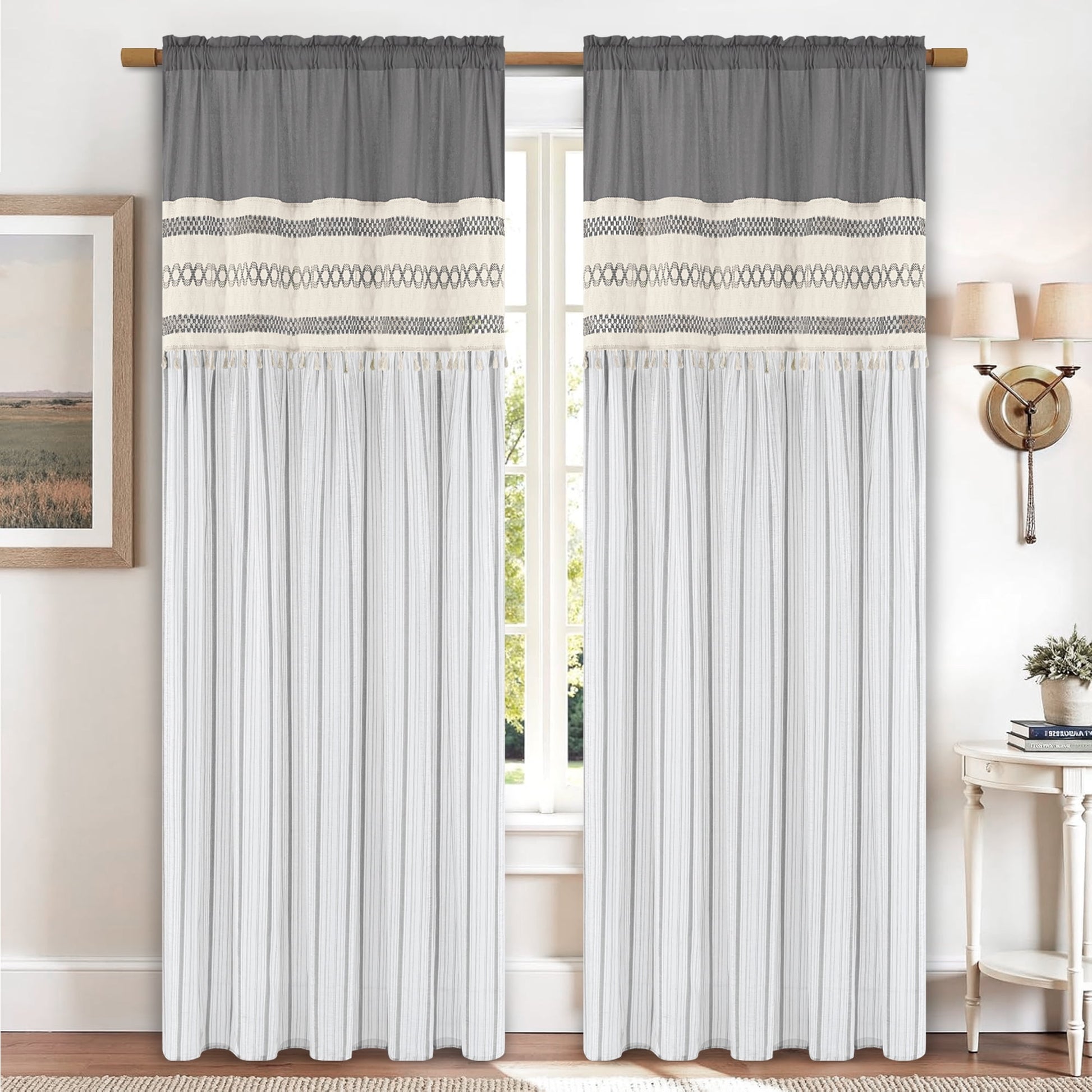 1、Boho Farmhouse Style : The farmhouse curtain has stripe design and tassels , suitable for any room in your country home.The bohemian macrame burlap adds a touch of farmhouse country to your room .