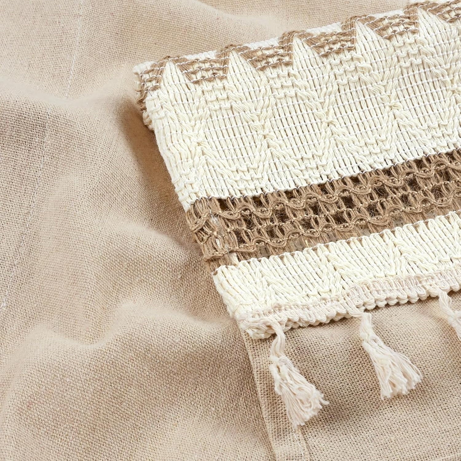 Alishomtll Boho Linen Light Filtering Curtains 84 Inches Long Farmhouse Rustic Striped Drapes Macrame Burlap ,Rod Pocket ,Beige ,with Tassel