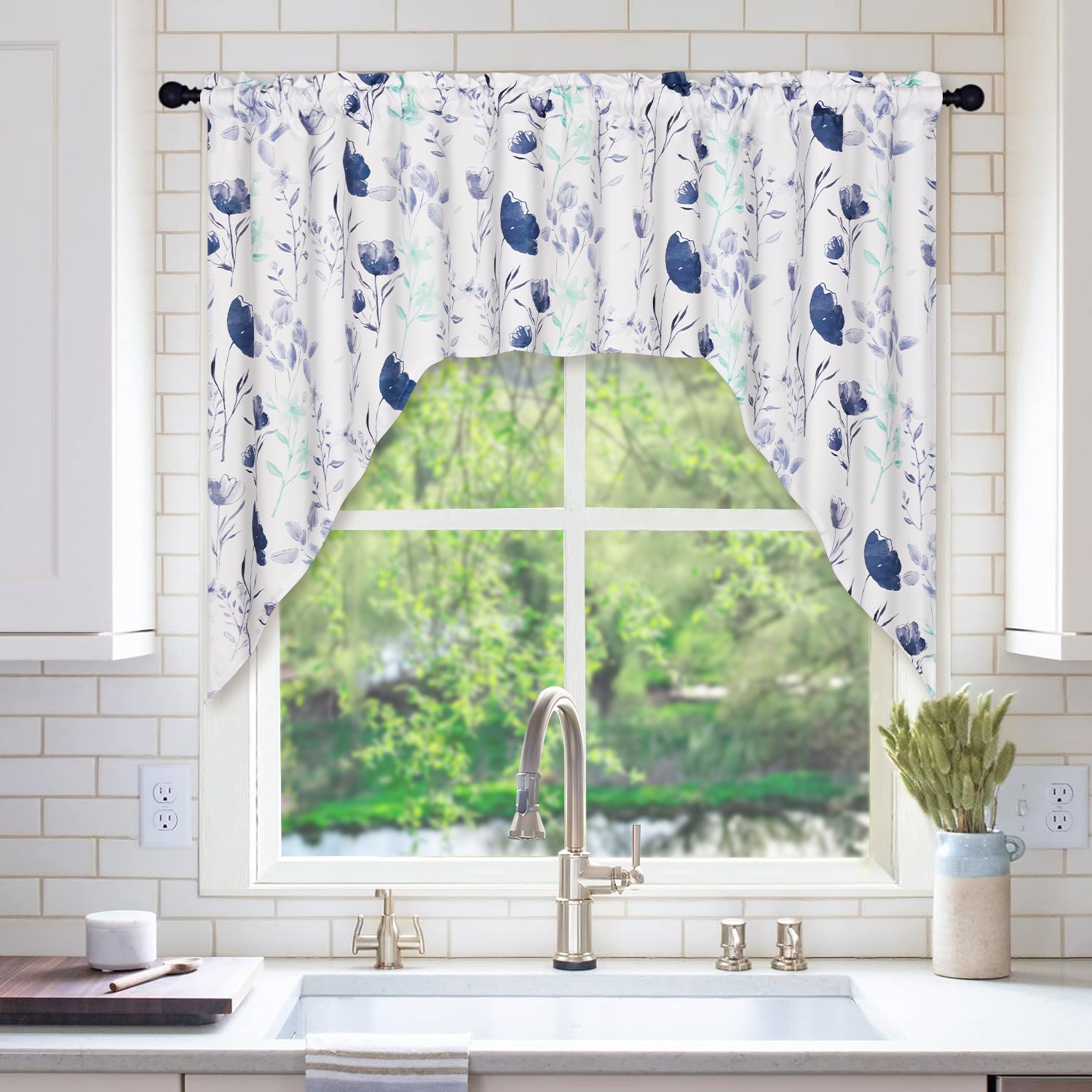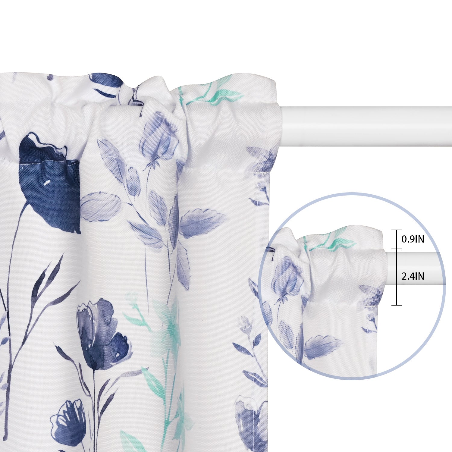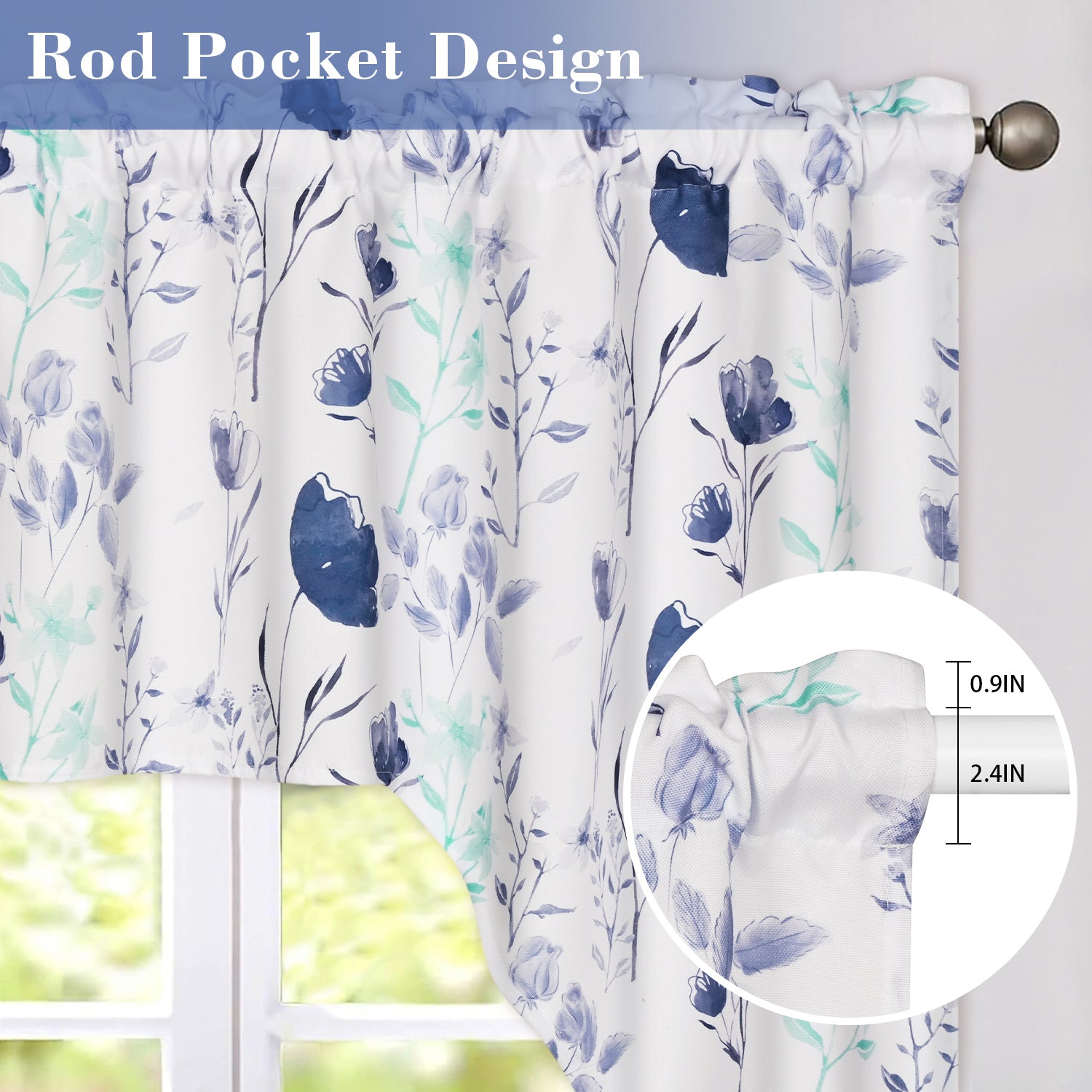 4、SIZE SPECIFICATIONS: Floral kitchen curtains per package - 60”W x 36” L/panel. 2'' high rod pocket can accommodate a 0.8'' diameter window rod, which can be easily hung on standard or decorative curtain rods.