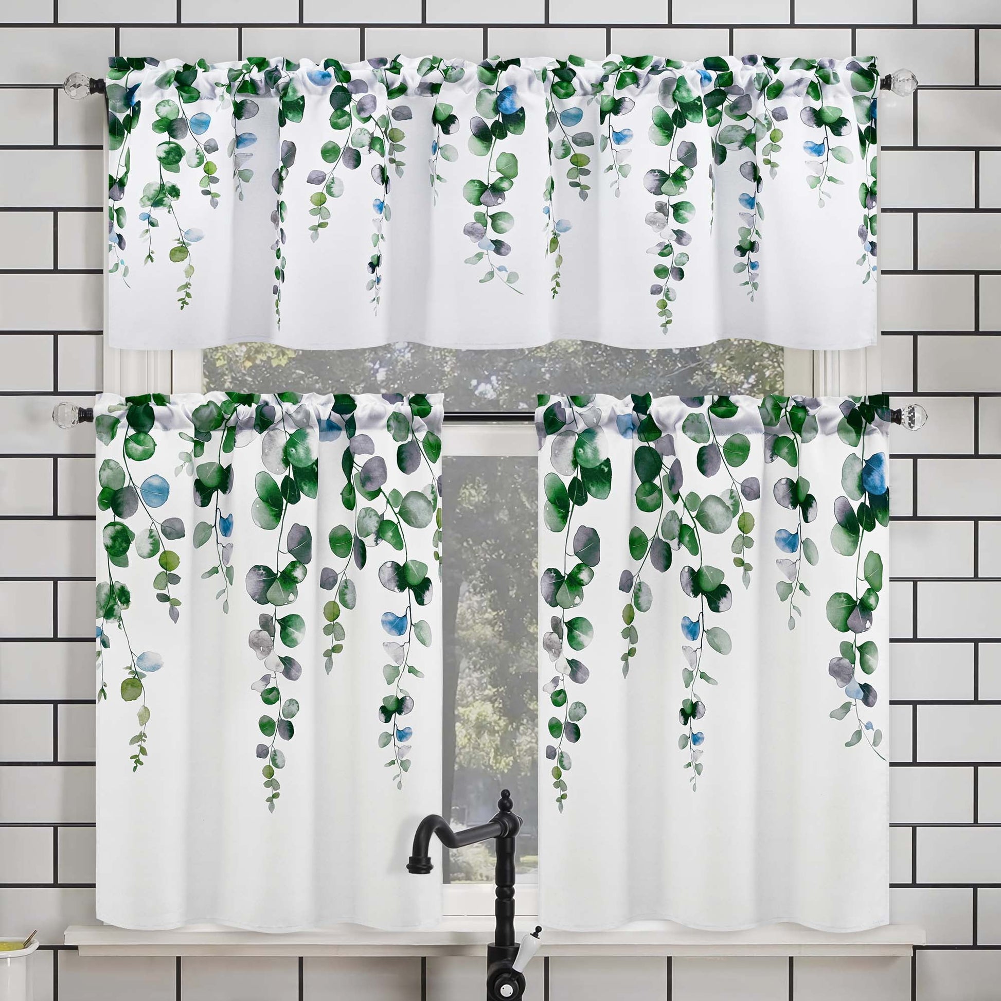 Alishomtll Kitchen Curtains and Valances Sets Grey Green Watercolor Leaves Print Kitchen Curtains 3 Piece Set 36 Inches Long,Rod Pocket