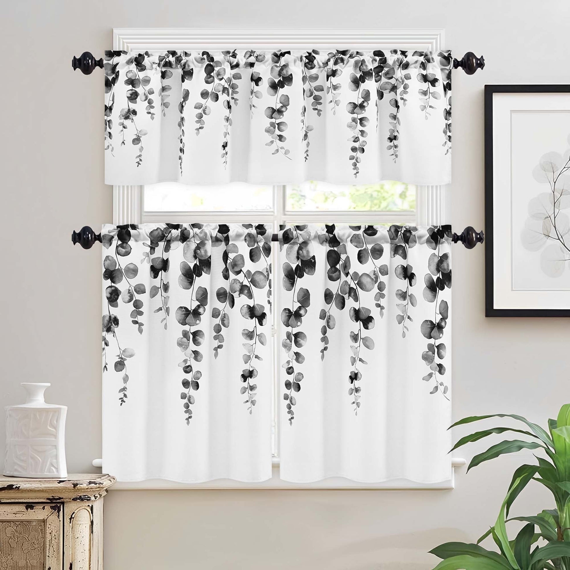 Alishomtll Kitchen Curtains and Valances Sets Grey Watercolor Leaves Print Kitchen Curtains 3 Piece Set 36 Inches Long,Rod Pocket