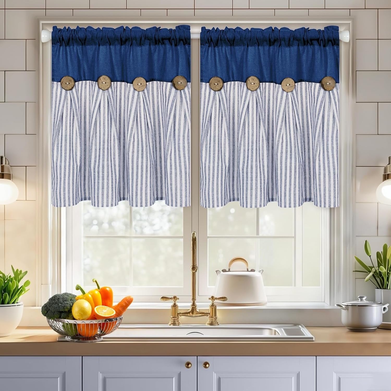 Alishomtll Stripe Kitchen Curtains 8 Button Linen Cotton Window Curtains Sets 24 Inches Long ,Rod Pocket