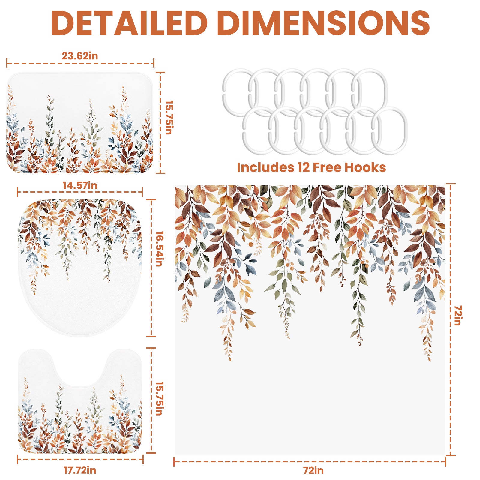 Size: Shower Curtain: 72" L x 72" W; U Shape Rug: 17.7" L x 15.8" W; Bathroom Mat: 23.6" L x 15.8" W; Toilet Lid Cover: 16.5" L x 14.6" W