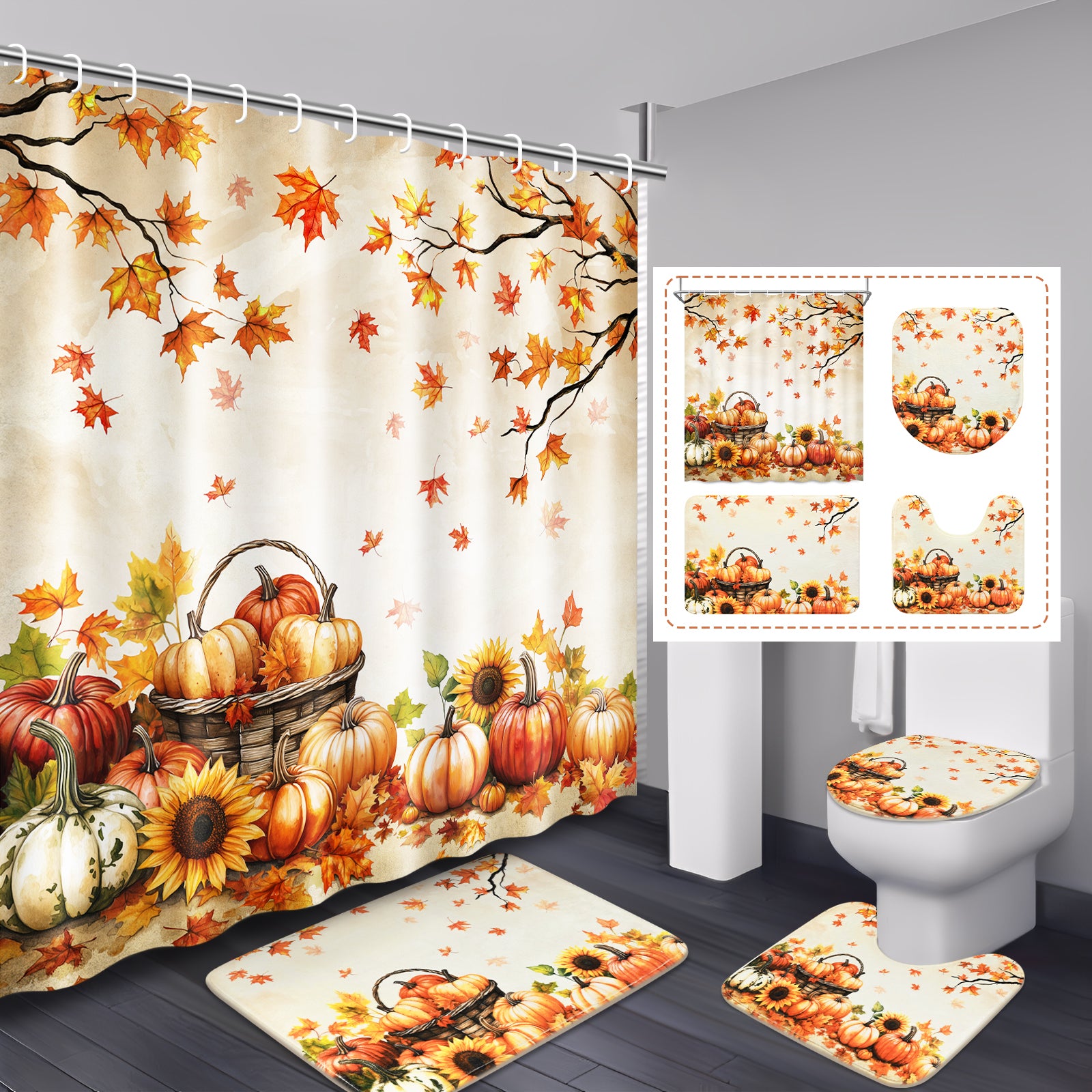 FRAMICS 16-Piece Fall Harvest Thanksgiving Shower Curtain Sets with Rugs, Maple Leaves Pumpkin Bathroom Sets, Waterproof Fabric Bathroom Curtain Decor with Hooks