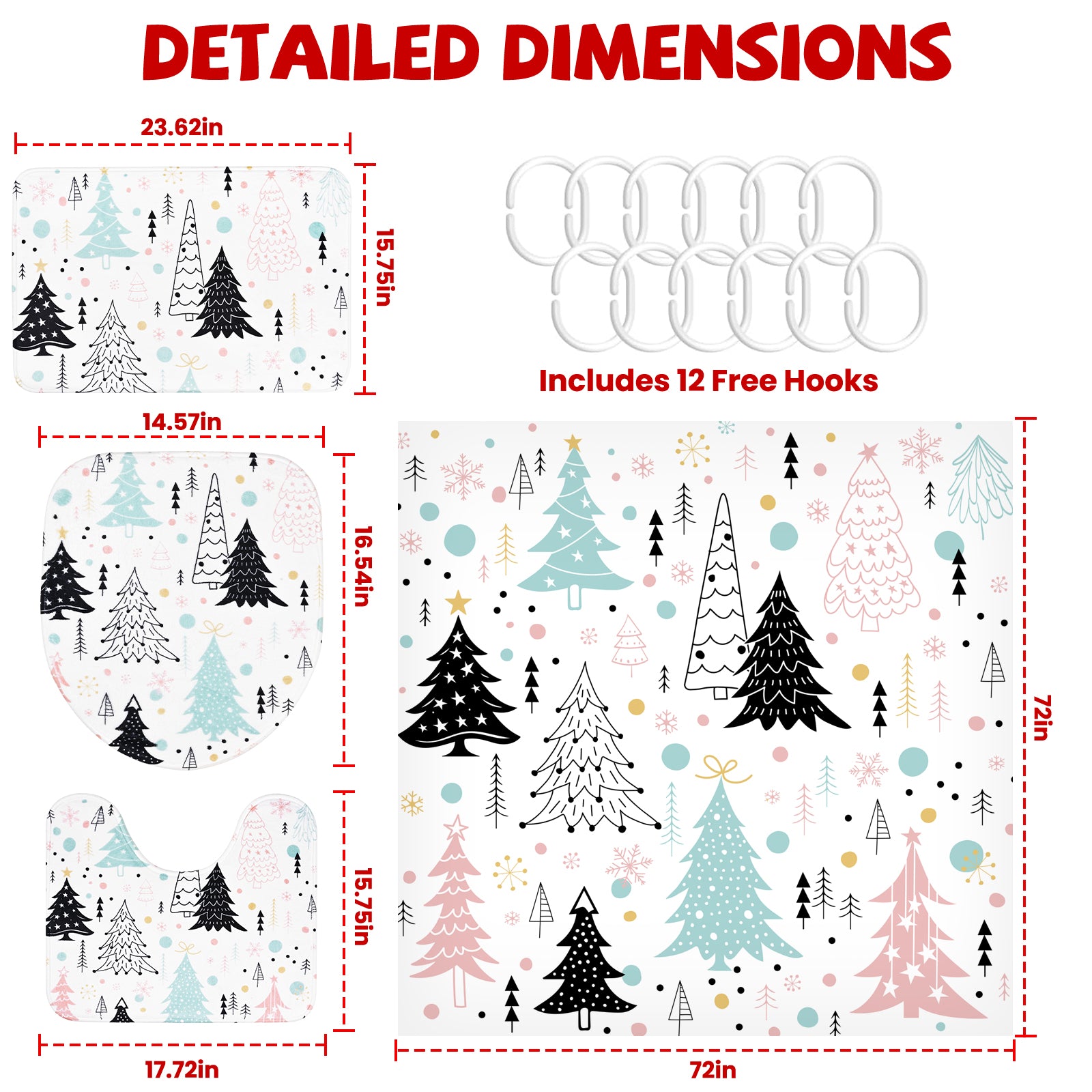 16-Piece Christmas Bathroom Set: Complete bathroom decor upgrade featuring shower curtain, bath mat, toilet lid cover, U-shaped rug, and 12 hooks – all adorned with cute Christmas tree designs.
