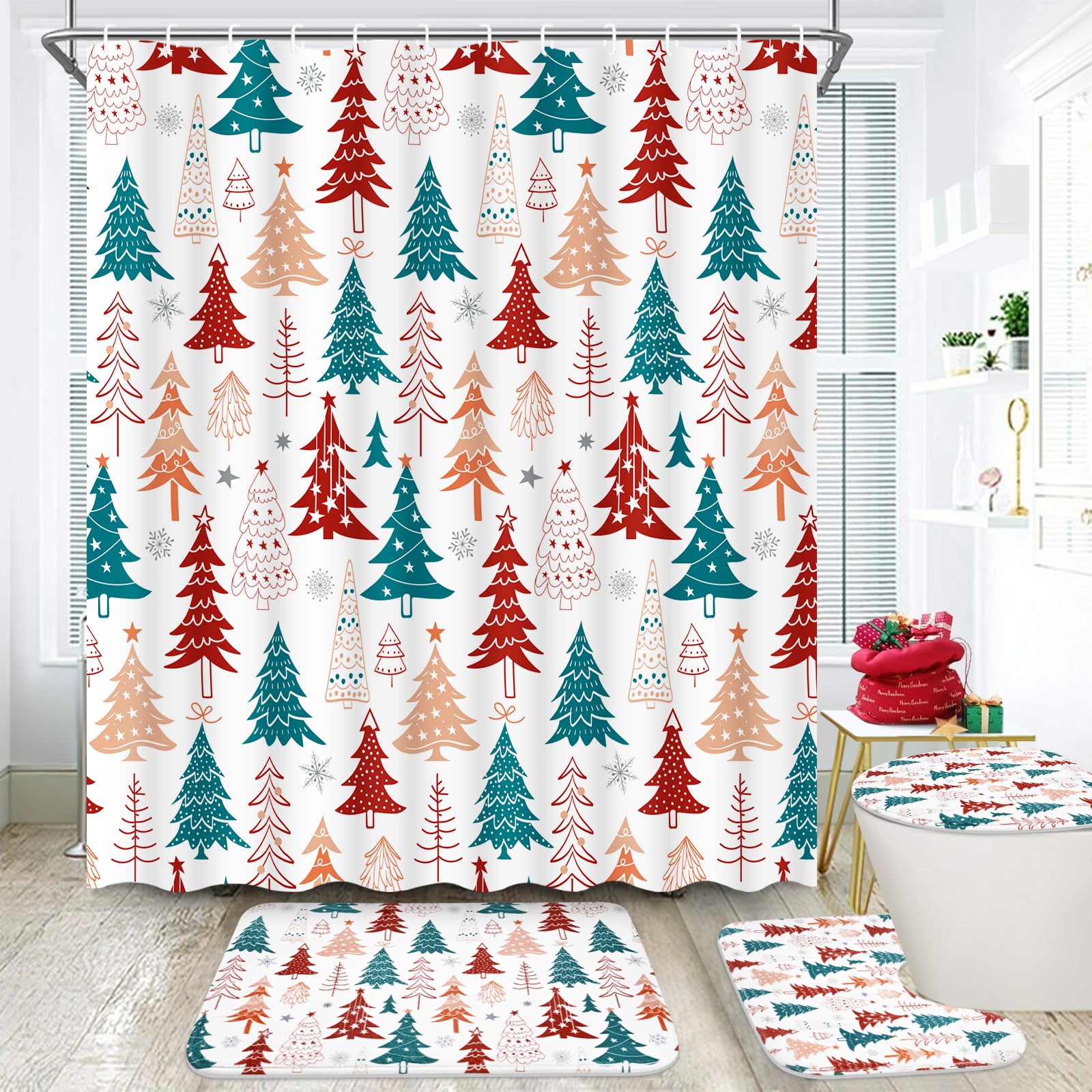 16-Piece Christmas Bathroom Set: Complete bathroom decor upgrade featuring shower curtain, bath mat, toilet lid cover, U-shaped rug, and 12 hooks – all adorned with cute Xmas tree and snowflake designs.