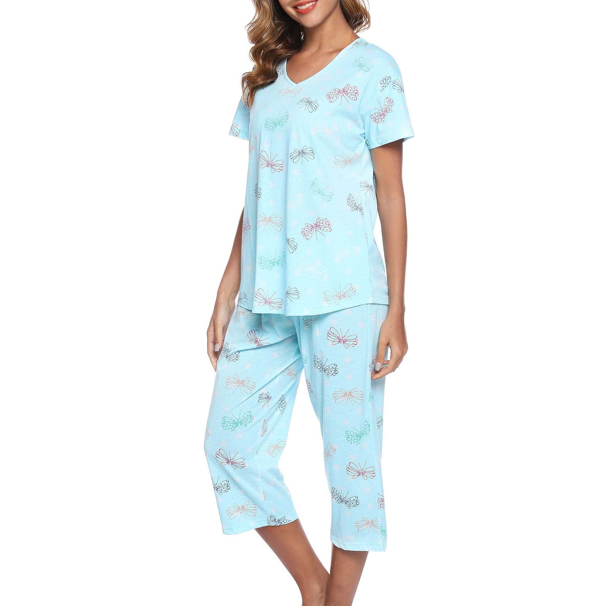 - Design Features: Womens tow-piece pajamas set, Comfortable elastic waist capri pants, matching with V-neck short sleeve shirt (Part Round Neck),Beautiful prints and cute animal prints make these nightwear set cute and stylish.It is the perfect choice for home leisure.